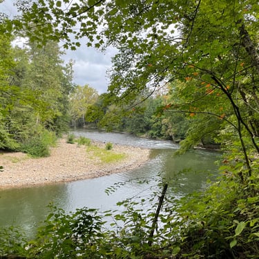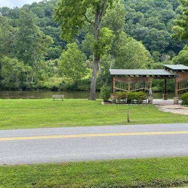 At around nine miles, we passed the refurbished train station at Alvarado, moving back into a shady canopy of trees, the trail eventually becoming two vehicle tracks with a narrow grassy median. Always on our left, the Holston River alternated between still, stagnant-looking stretches to frothy mini-rapids.